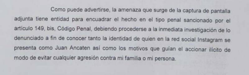 Según obra en la causa, el 12 de enero, Montenegro recibió los mensajes amenazantes desde la cuenta antes mencionada y por ello pide que se investigue tanto la identidad del denunciado como "los motivos que lo guían".