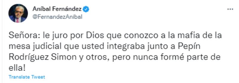 "Señora: le juro por Dios que conozco a la mafia de la mesa judicial que usted integraba junto a Pepín Rodríguez Simón y otros, pero nunca formé parte de ella", aseguró esta mañana el nuevo titular de Seguridad en un posteo a través de su cuenta en la red social Twitter.