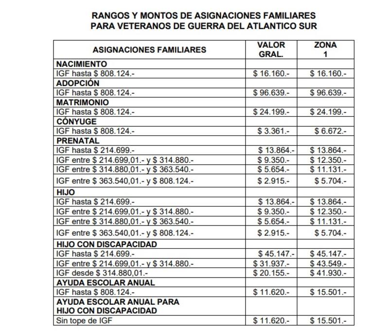 - Asignación Familiar para veteranos de Guerra del Atlántico Sur;