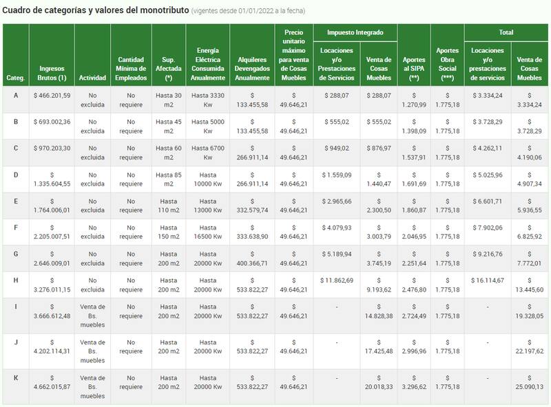 Por su parte, todos los contribuyentes de la categoría B pasarán de pagar $ 2958 de cuota a $ 3728. La cuota de la última escala permitida, la H, pasa para servicios de $ 12.789 a $ 13.445.