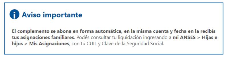 "El complemento se abona en forma automática, en la misma cuenta y fecha en la recibís tus asignaciones familiares", indicó el organismo conducido por Fernanda Raverta a través de su sitio web.