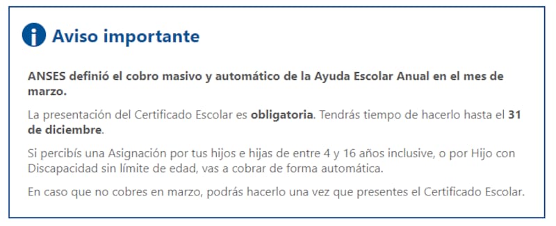 "La presentación del Certificado Escolar es obligatoria. Tendrás tiempo de hacerlo hasta el 31 de diciembre. Si percibís una Asignación por tus hijos e hijas de entre 4 y 16 años inclusive, o por Hijo con Discapacidad sin límite de edad, vas a cobrar de forma automática. En caso que no cobres en marzo, podrás hacerlo una vez que presentes el Certificado Escolar", anticipó el organismo conducido por Fernanda Raverta.