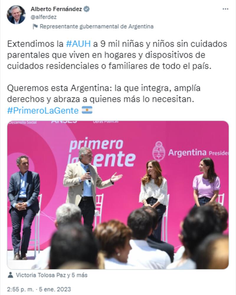 "Extendimos la AUH a 9 mil niñas y niños sin cuidados parentales que viven en hogares y dispositivos de cuidados residenciales o familiares de todo el país. Queremos esta Argentina: la que integra, amplía derechos y abraza a quienes más lo necesitan", subrayó el mandatario en redes sociales.