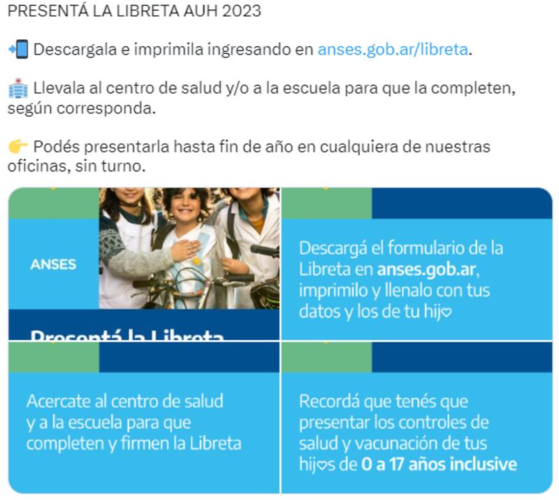 "Te recordamos que tenés que presentar el formulario de Libreta todos los años. Esta presentación se realiza de forma presencial y no necesitás turno previo. Tenés tiempo hasta el último día hábil de 2023", puntualizó ANSES en el sitio oficial.