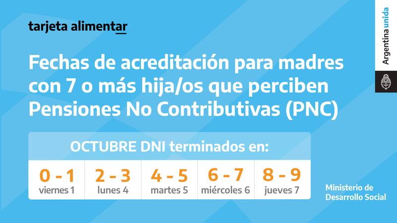 Las madres de 7 hijos con Pensión no Contributiva (PnC) cobrarán el saldo de la Tarjeta Alimentar junto con el monto mensual de ANSeS a partir del viernes 1 de octubre, según la terminación del DNI.