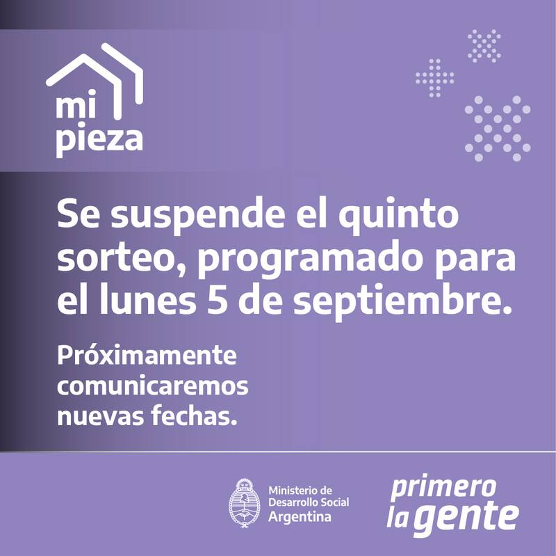 Por ese motivo el Ministerio de Desarrollo Social publicó un mensaje clave en sus redes sociales: "Por los sucesos de público conocimiento, se posterga el quinto sorteo de Mi Pieza que iba a realizarse el 5 de septiembre. Les pedimos disculpas a todas las mujeres inscriptas por este retraso".