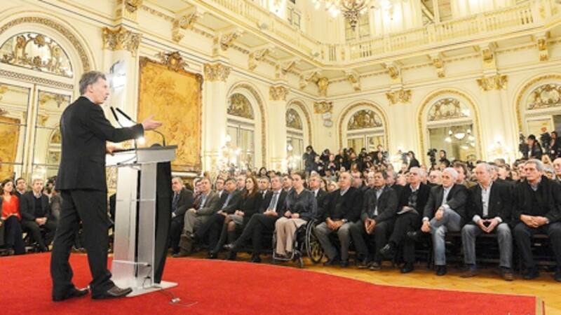 El mandatario encabezó un acto en el Salón Blanco, frente a líderes gremiales peronistas, que integraron la CGT oficial durante el kirchnerismo, como Gerardo Martínez (UOCRA), Antonio Caló (UOM) y Andrés Rodríguez (UPCN), entre otros. En ese marco, el Gobierno mostró a figuras como el jefe de Gabinete, Marcos Peña y la gobernadora María Eugenia Vidal.
