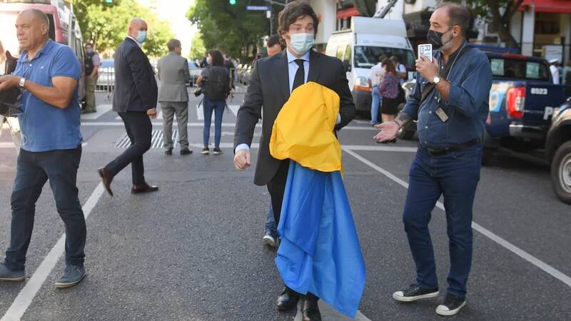 El diputado nacional de La Libertad Avanza, Javier Milei, llegó al Congreso para asistir al discurso de apertura de sesiones ordinarias, que dará Alberto Fernández a partir de las 12, con la bandera de Ucrania en sus manos.