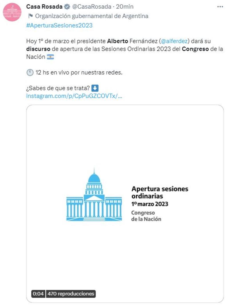 Quienes deseen ver en vivo el mensaje del mandatario podrán hacerlo a través del canal de YouTube de Casa Rosada, que trasmitirá el movimiento previo en el Congreso, el recorrido en automóvil que hará el Presidente desde Casa de Gobierno hasta la intersección de Rivadavia y Entre Ríos, el ingreso al recinto y el discurso completo, pautado para el mediodía.