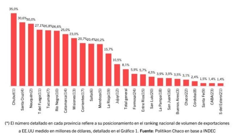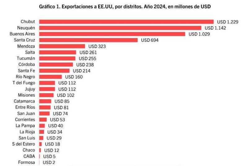 Según un relevamiento de Politikon, la provincia de Chubut es la principal exportadora argentina a los EE.UU., con un total en 2024 de u$s 1.229 millones, equivalente al 19% del total exportado por la Argentina a ese país.
