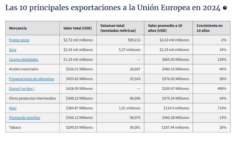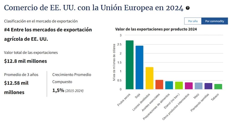 En este sentido, marcó que el comercio de EEUU con la UE, en 2024, alcanzó los u$s 12.800 millones, con los frutos secos encabezando el podio entre los 10 productos con mayor inserción por u$s 2.720 millones. Luego se destaca soja (u$s 2.4300 millones) y licores destilados (u$s 1.230 millones).