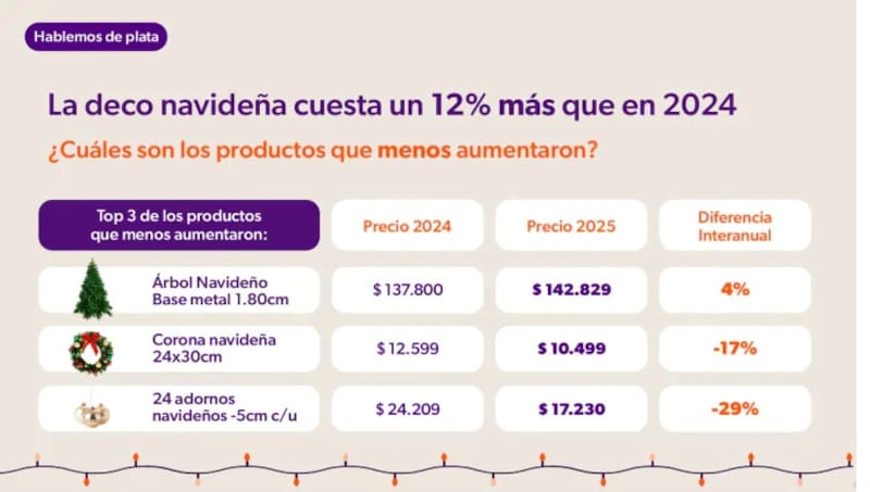 El estudio, que comparó los precios de noviembre 2024 con noviembre 2025, analizó el valor de productos esenciales para ambientar el hogar durante las fiestas: desde el árbol artificial hasta las guirnaldas, pasando por luces LED, esferas y pesebres.