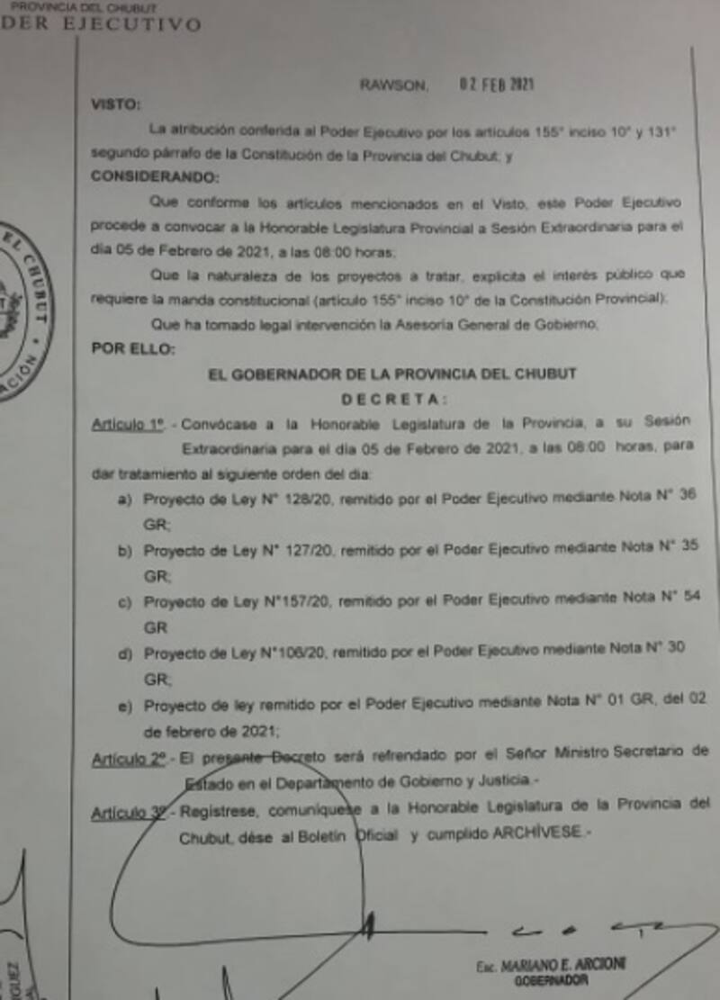 Según el decreto N°50, firmado por el mandatario provincial, la convocatoria es para el viernes a las 8 y el orden del día incluye el tratamiento de cinco proyectos, el primero de los cuales (Proyecto de Ley 128/20) es el de Desarrollo Productivo en la Meseta de Chubut, que incluye la zonificación minera.