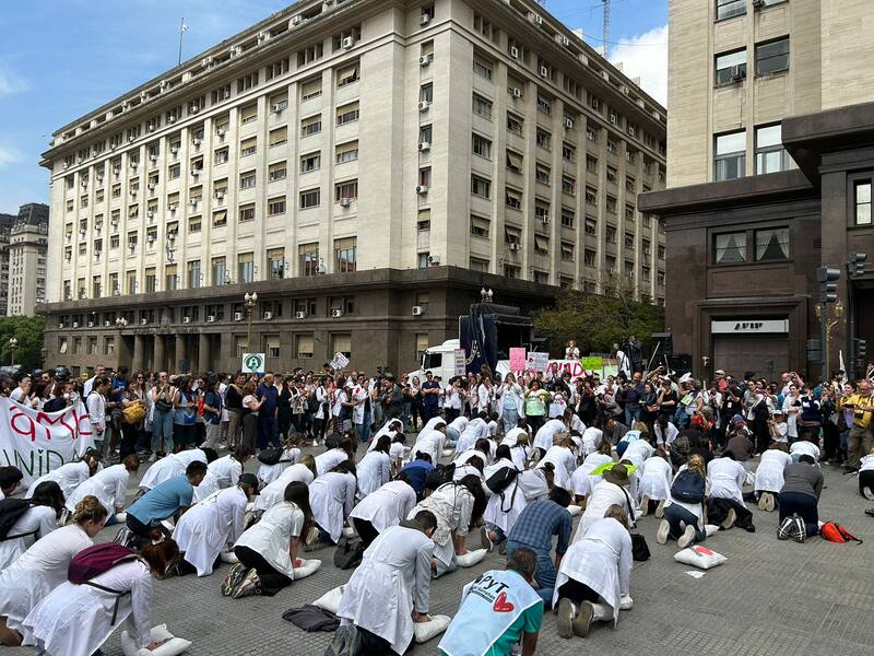 Mientras tanto, desde el Palacio de Hacienda se escuchaba el "ruidazo" de una movilización que había sido organizada por los trabajadores de la salud pública, en reclamo de aumentos salariales, mejores condiciones de trabajo y tras el cierre del hospital Bonaparte, que el Gobierno asegura que se trata de una "reestructuración".