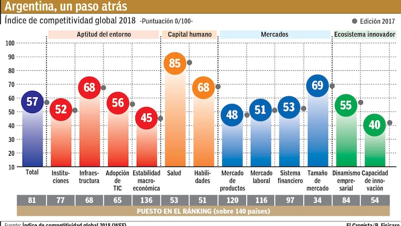 La Argentina cayó al puesto 81° en el Ranking de Competitividad Global 2018-2019 que elabora anualmente el prestigioso Foro Económico Mundial (WEF, por su sigla en inglés), arrastrado en gran medida por el entorno macroeconómico, que, según el informe, fue impactado por la inflacióny la devaluacion del peso frente al dólar.