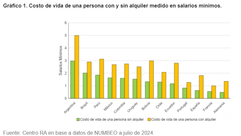 Brasil es el segundo país más caro de la región, pero en Argentina se necesita un salario más para adquirir una canasta de consumo básica y dos salarios mínimos más si se considera el alquiler. La comparación surge de un nuevo informe del Centro de Estudios para la Recuperación Argentina (RA) de la Universidad de Buenos Aires (UBA).