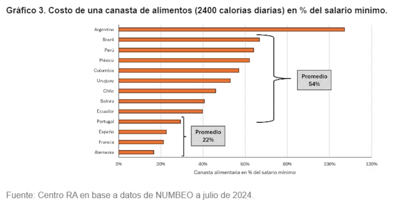 El estudio detalla que en comparación con la región, en Argentina se requiere en promedio del doble de ingreso para adquirir una canasta de alimentos de 2400 calorías diarias respecto a los países de la región, y casi cinco veces más de ingreso en promedio que en los países europeos para poder adquirir la misma canasta de bienes. "Como el país está dentro de los 10 productores mundiales de alimentos, los precios deberían ser bajos" debido a la alta oferta, agrega el análisis.