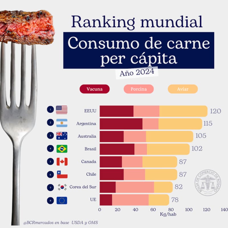 En base a datos del Departamento de Agricultura de Estados Unidos (USDA por sus siglas en inglés) y de la Organización Mundial de la Salud (OMS), considerando las tres principales categorías: bovina, aviar y porcina, el informe de la BCR destaca que, en 2024, Argentina se habría consolidado como el segundo país con mayor consumo promedio de carne per cápita a nivel mundial.
