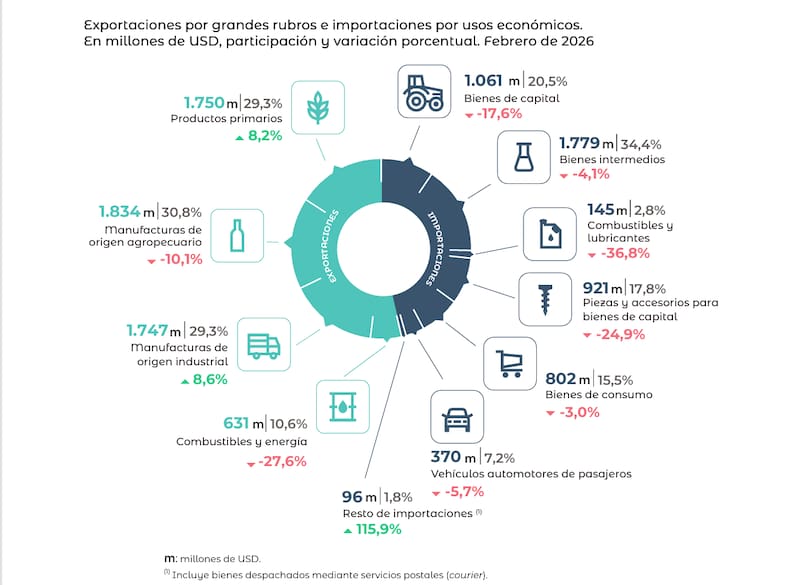 El análisis de los datos revela que el saldo positivo actual se explica más por la caída de las importaciones que por un boom exportador. Mientras que en enero el motor fue el crecimiento de las ventas, en febrero el superávit se sostuvo porque las compras al exterior cayeron con mucha más fuerza que las ventas.