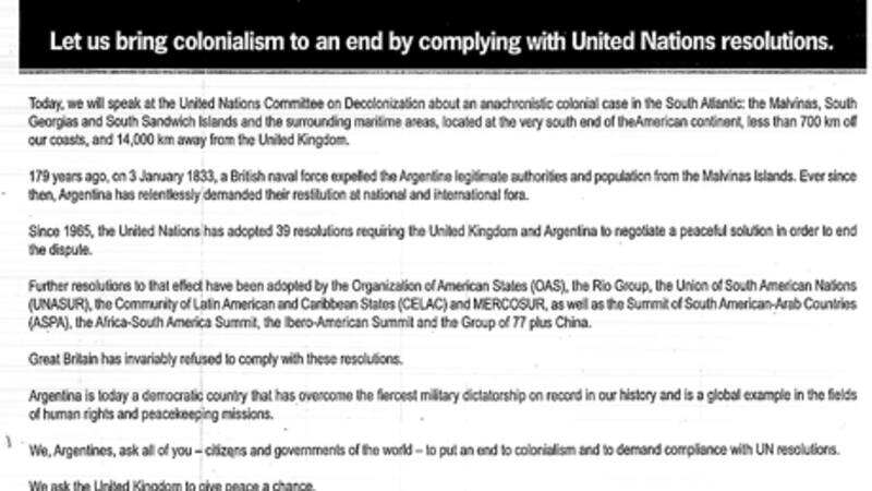 Cristina Kirchner dejó ayer bien en claro que la negociación por la soberanía de Malvinas es con el Reino Unido y no con los kelpers. No sólo no contestó las acusaciones previas de los representantes malvinense, sino que además el canciller Héctor Timerman se negó a recibir una carta que Michael Summer, miembro de la Asamblea Legislativa isleña, quiso entregarle con un mensaje para la Presidente, cuando finalizó la sesión del Comité de Descolonización en la ONU.