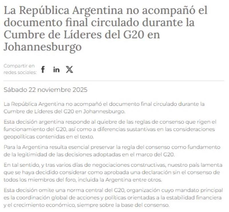 Esta mañana, la Cancillería argentina ratificó la decisión del Poder Ejecutivo, señalando “diferencias sustantivas en las consideraciones geopolíticas contenidas en el texto” y un “quiebre de las reglas de consenso que rigen el funcionamiento del G20″.