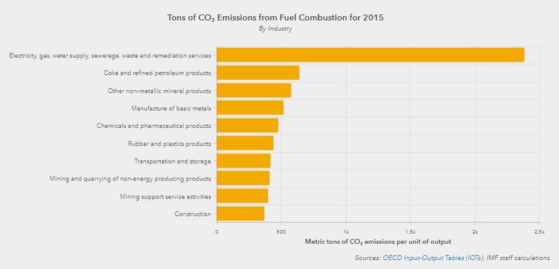 Por otra parte, en base a datos del 2015, los gráficos del FMI muestran cuáles son las 10 industrias con los mayores niveles de emisión de dióxido de carbono o CO por combustión.