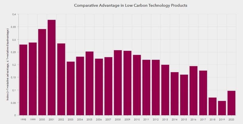 El próximo gráfico indica si Argentina tiene una ventaja o una desventaja en lo que respecta a la exportación de productos de tecnología baja en carbono. "Estos son productos que producen menos contaminación que sus contrapartes energéticas tradicionales y jugarán un papel vital en la transición hacia una economía baja en carbono", detalla el informe por país del Climate Change Dashboard del FMI.