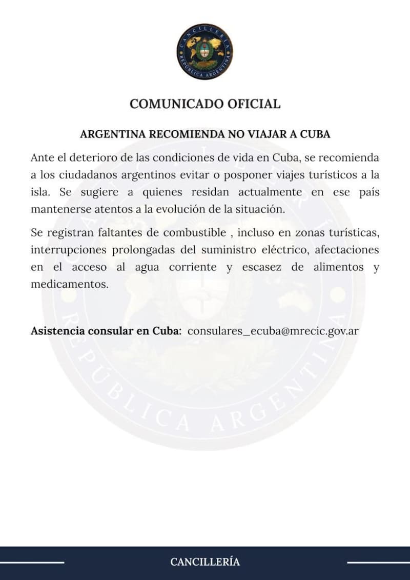 La Cancillería Argentina recomendó este viernes, a través de un comunicado, evitar o posponer viajes turísticos a Cuba, ante el “deterioro de las condiciones de vida” en la isla por el faltante de petróleo.