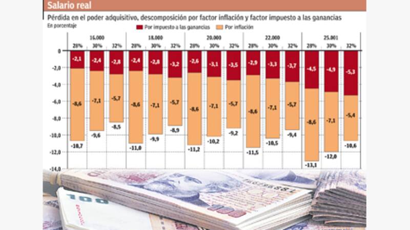 Por este motivo, un empleado que cobra más de $ 25.000 y acordó un incremento del 30%, tendrá una pérdida de poder adquisitivo mayor, en torno a 12% en 2014, explicada en un 41% por el impuesto y en un 59% por suba de precios.