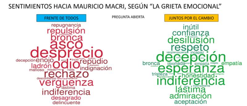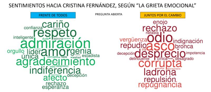 En una pregunta abierta donde los encuestados podían responder libremente los sentimientos que les generaban los dos principales políticos argentinos, para Cristina Kirchner predominó la "admiración", el "amor" y el "respeto" entre los oficialistas y el "odio", el "asco" y el "desprecio" entre los opositores.