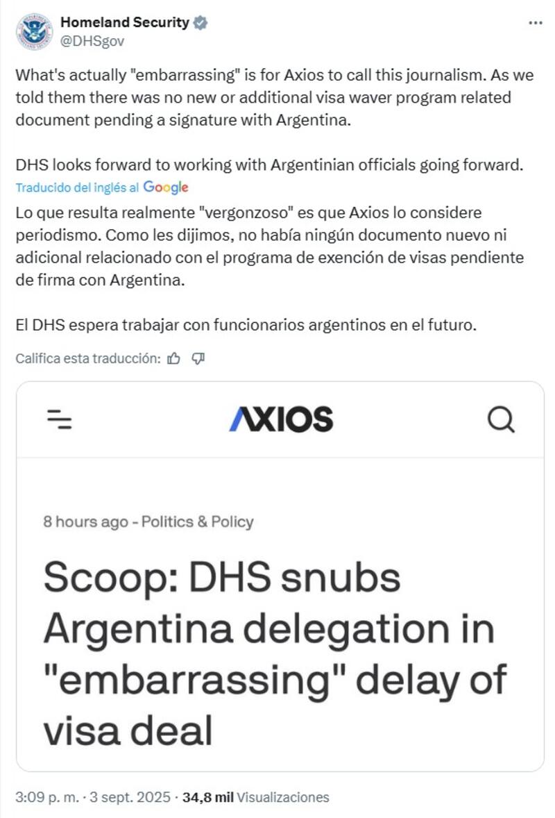 "Lo que resulta realmente 'vergonzoso' es que Axios lo considere periodismo", lanzó mediante un posteo en las redes sociales. Por otra parte, remarcó que "como les dijimos, no había ningún documento nuevo ni adicional relacionado con el programa de exención de visas pendiente de firma con Argentina".
