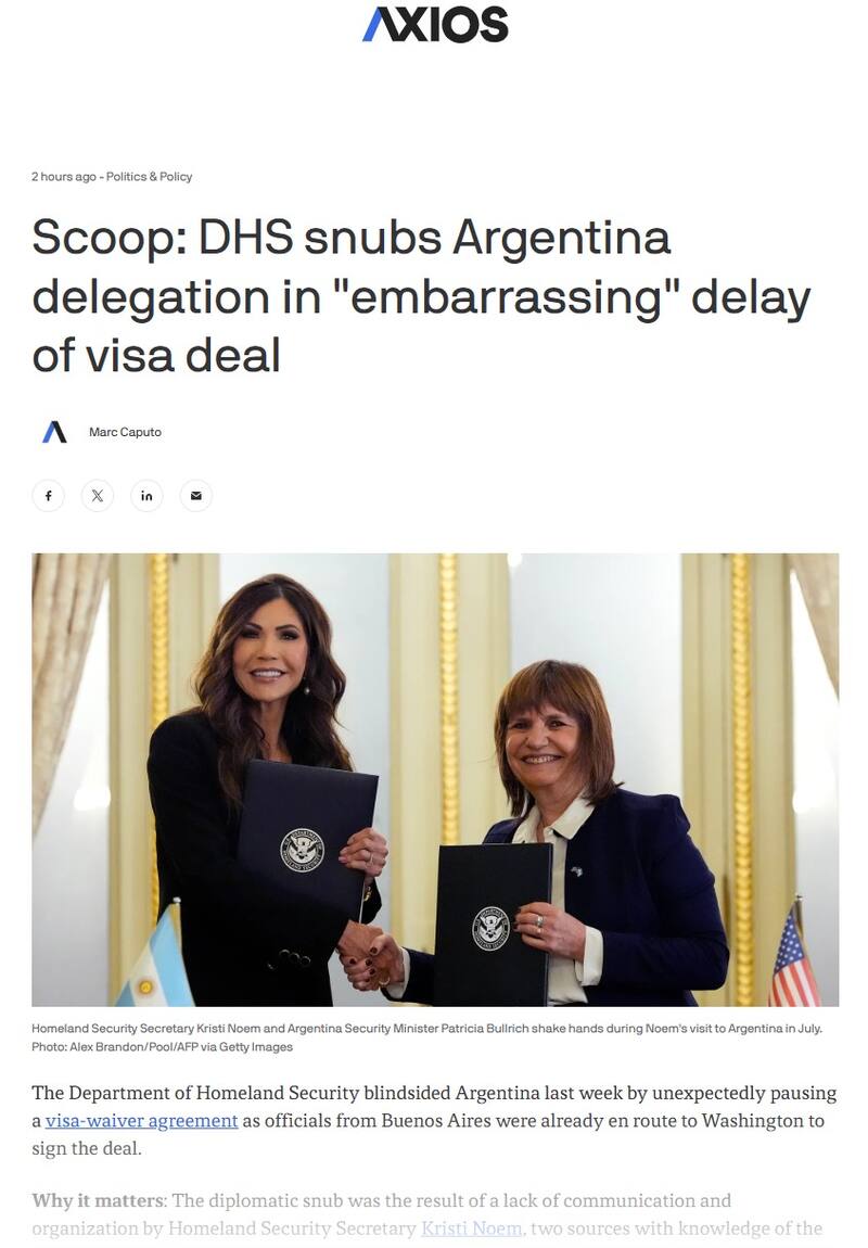 Este contratiempo llega en una instancia en la que Estados Unidos había estrechado lazos con la Argentina bajo el liderazgo de Milei, que, según destaca Axios en el mismo artículo, "ha implementado políticas de libre mercado y ha buscado alinear más estrechamente a su país con Washington". Noem había elogiado incluso previamente a Milei en comunicados de prensa relacionados con el acuerdo de visas.