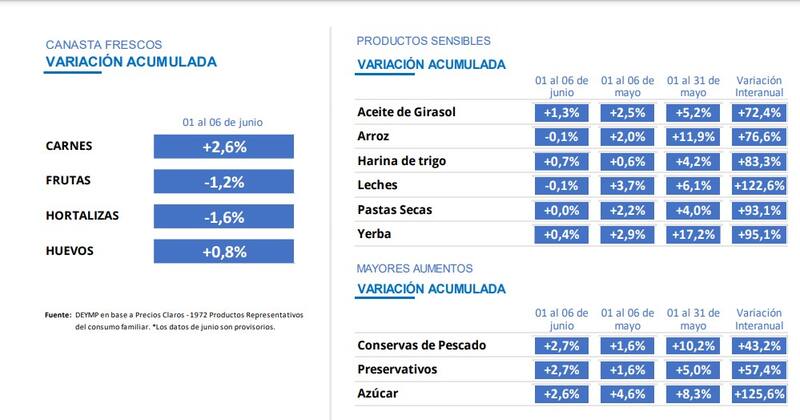En este periodo, del 1 al 6 de junio, las harinas, derivados y cereales acumularon una suba de 0,1%, los lácteos un 0%, aceites y manteca 0,8%, azúcar, dulces y golosinas 0,7% y por último infusiones 0,3%.