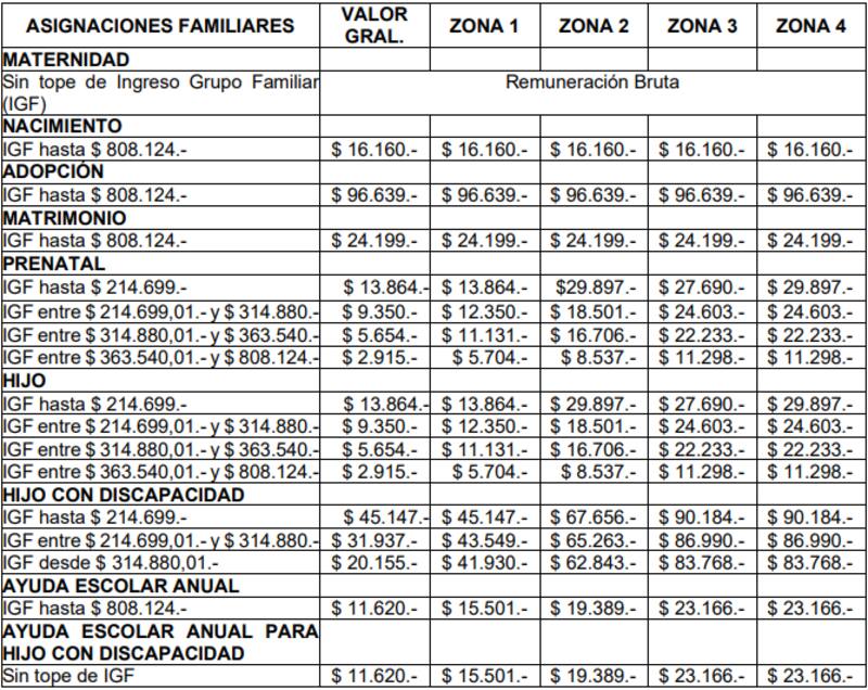 Según la zona y los ingresos familiares, a los titulares de la Prestación por Desempleo también les corresponden los siguientes montos por Asignaciones Familiares:
