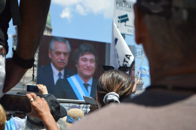 "Lo me que me atrajo de Javier fueron sus propuestas liberales y el pensamiento de querer cambiar el abismo en el que estamos" reconoce Fernando, que está junto a Cristian, su amigo, tirado en el pasto de las afueras de la Casa Rosada, en la Plaza de Mayo. Es la primera vez que asiste a una asunción presidencial. Ambos pertenecen al Partido Libertario de Quilmes, un conglomerado de corrientes liberales, y trabajan en el ámbito privado.