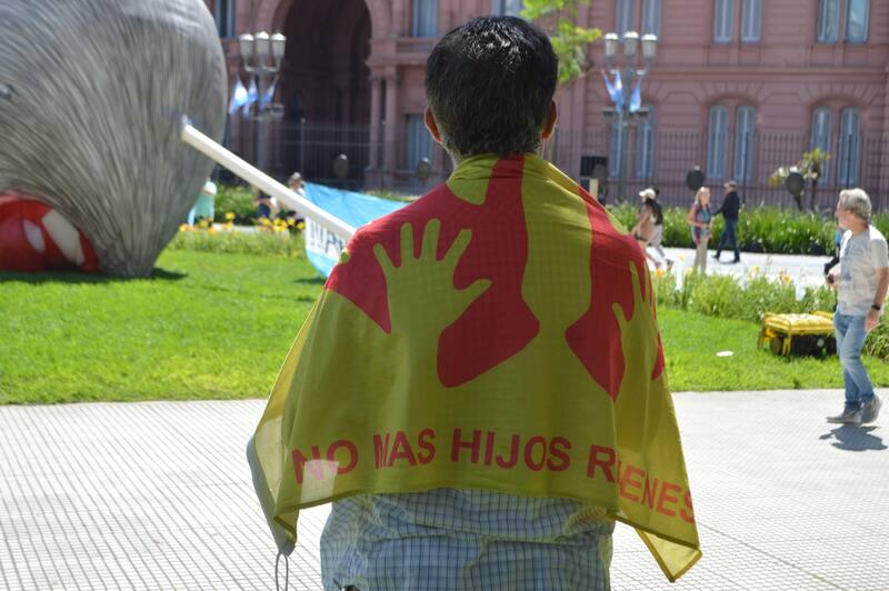 Sin embargo, el libertario se ganó su voto de confianza por otro motivo. En sus hombros Richard lleva colgada una bandera que reza "No más hijos rehenes", una organización que tiene como objetivo defender los derechos de "las infancias judicializadas".