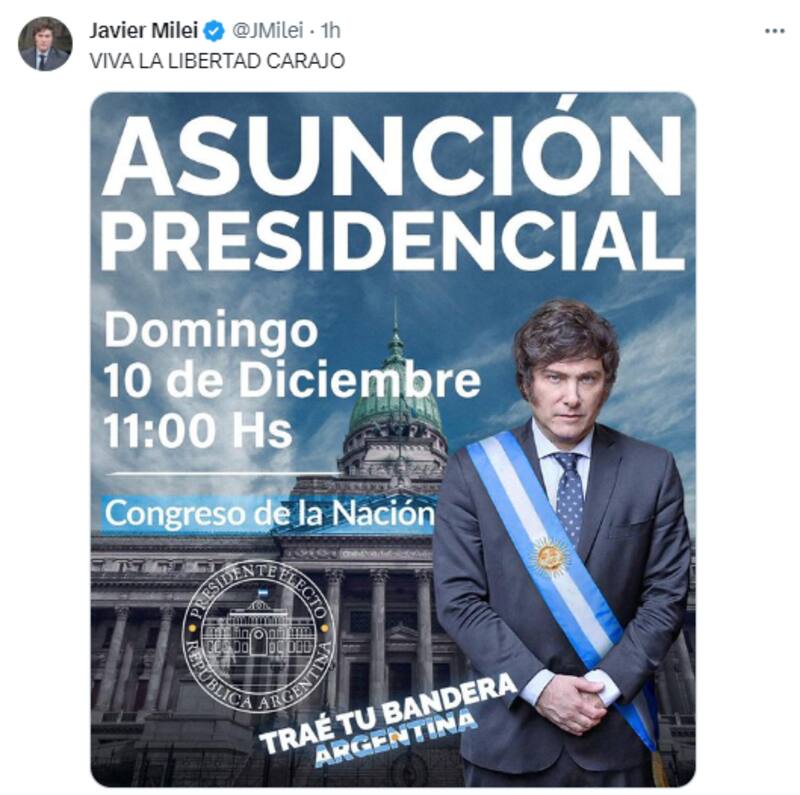 "Asunción presidencial. Domingo 10 de diciembre 11 horas. Congreso de la Nación. Trae tu bandera argentina", dice el flyer publicado esta mañana por Milei en su cuenta de la red social X (antes Twitter), junto a la leyenda "Viva la libertad carajo".