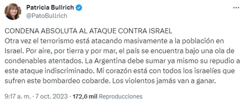 Por su parte Patricia Bullrich, candidata presidencial de Juntos por el Cambio, dijo también en su cuenta de la mencionada red social: "CONDENA ABSOLUTA AL ATAQUE CONTRA ISRAEL. Otra vez el terrorismo está atacando masivamente a la población en Israel. Por aire, por tierra y por mar, el país se encuentra bajo una ola de condenables atentados".