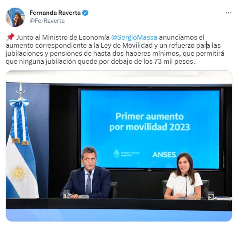 "El aumento será del 17,04% para jubilaciones, pensiones y asignaciones y se comenzará a pagar en marzo", repasó Raverta en redes sociales.