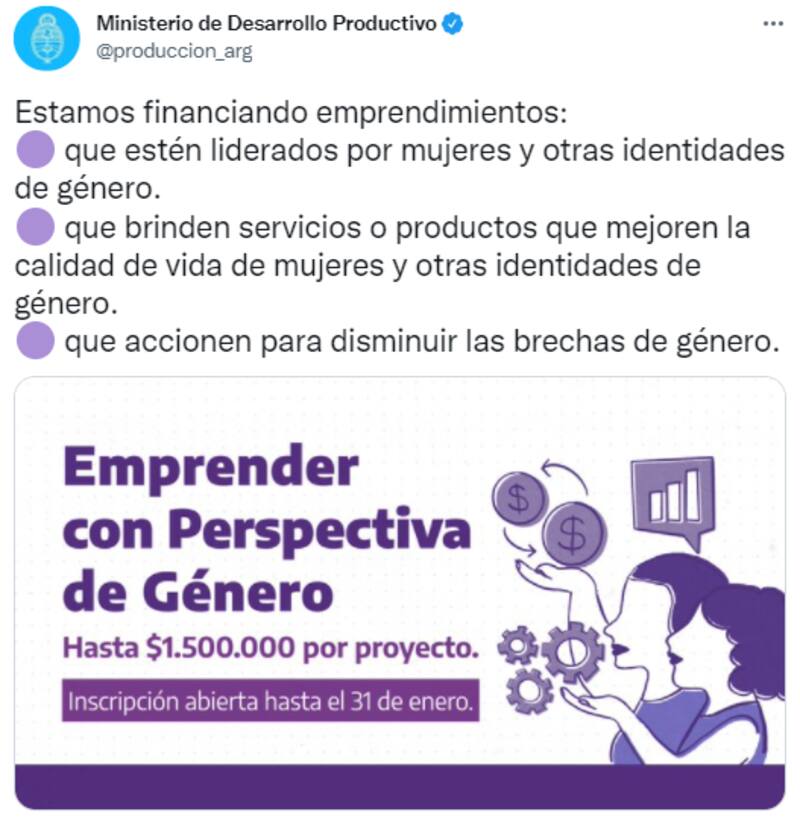 "Estamos financiando emprendimientos que estén liderados por mujeres y otras identidades de género; que brinden servicios o productos que mejoren la calidad de vida de mujeres y otras identidades de género; que accionen para disminuir las brechas de género", destacó la cartera conducida por el ministro Matías Kulfas en redes sociales.