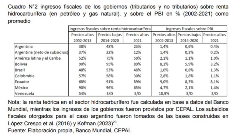 Al hacer la observación de los ingresos fiscales como porcentaje del PBI, Argentina percibe el 0,4% en 2023, contra el 1,4% entre 2002 y 2013. La actual es la peor posición en la región en términos de ingresos fiscales sobre la renta de hidrocarburos.