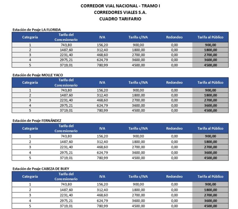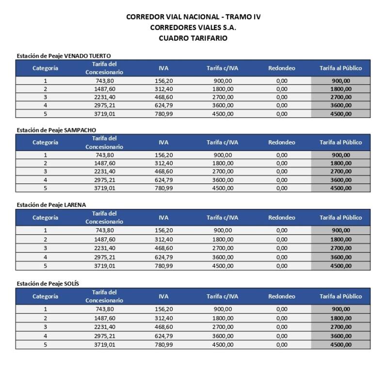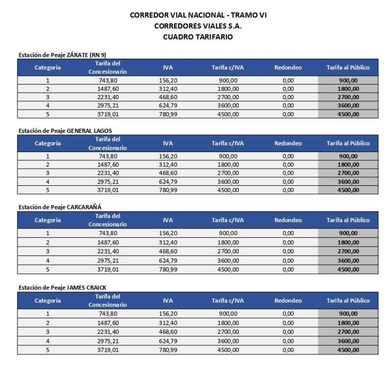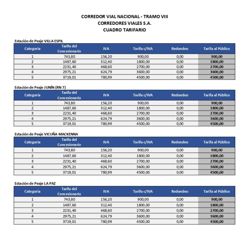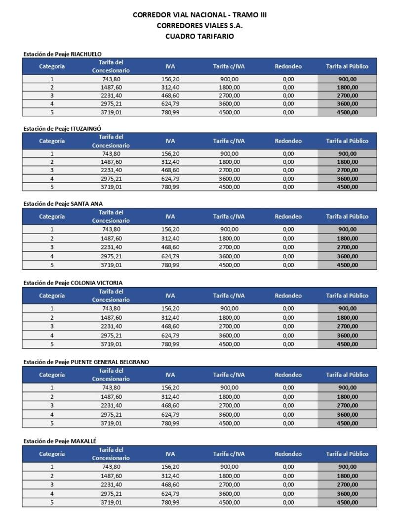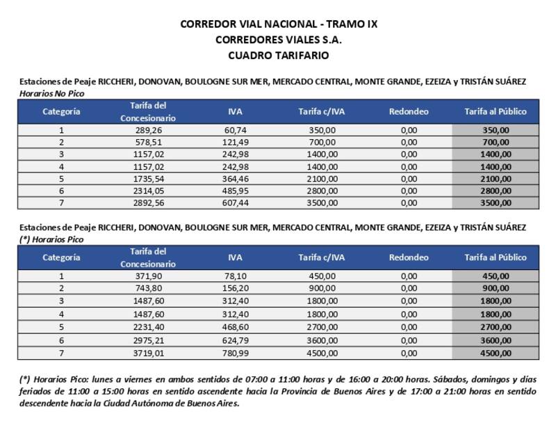 El Gobierno publicó el nuevo cuadro tarifario para los peajes de las rutas nacionalescontrolados por la empresa Corredores Viales S.A ubicados en provincia de Buenos Aires (inclusiveAutopista Riccheri-Ezeiza-Cañuelas), La Pampa, Santa Fe, Córdoba, San Luis, Mendoza, Corrientes, Chaco, Misiones, Santiago del Estero, Tucumán, Salta y Jujuy.