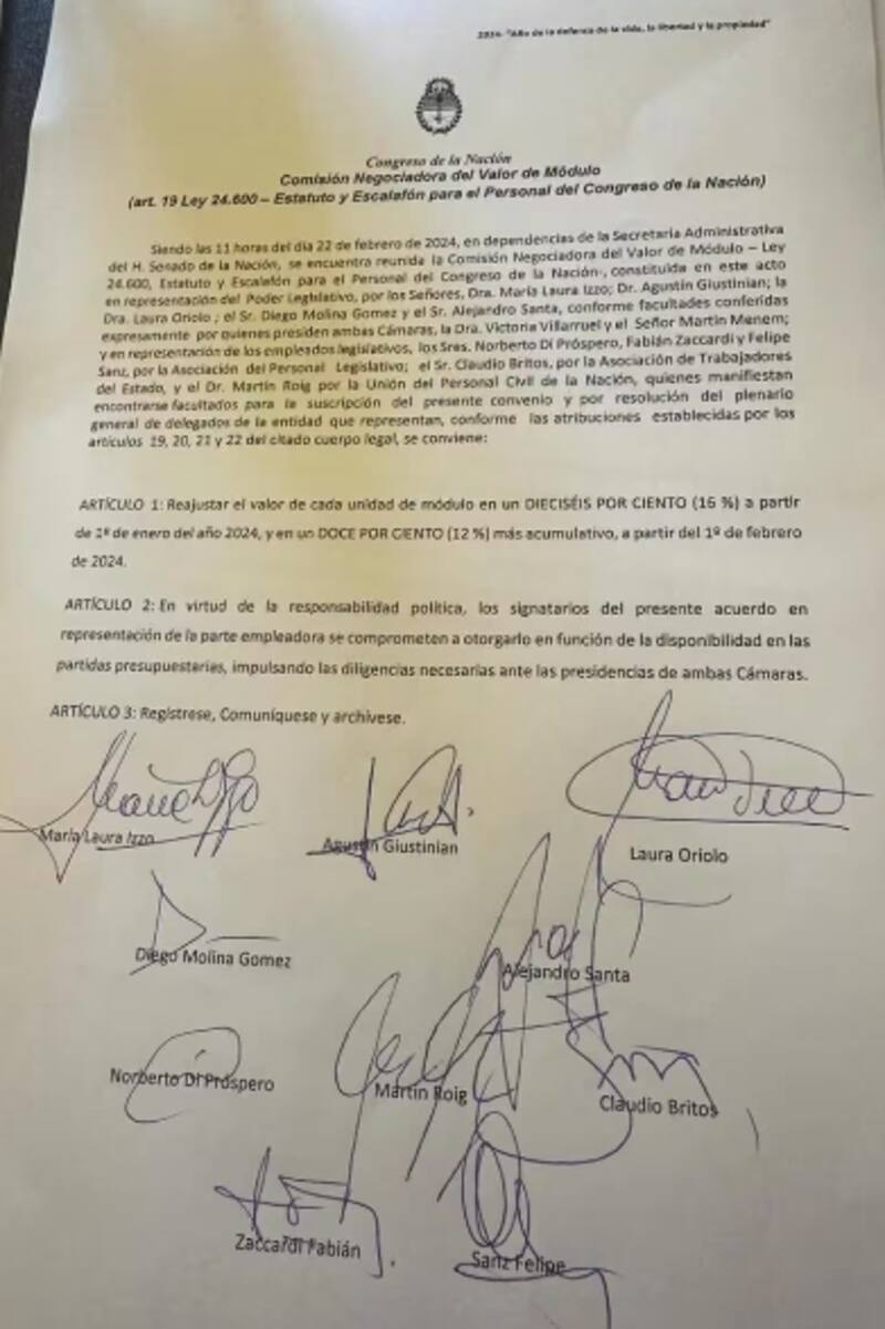 El convenio, firmado por los representantes del poder legislativo y los trabajadores, establece queel incremento salarial acumumilativo será del 16% a partir del 1° de enero de 2024 y del 12% desde el 1° de febrero.
