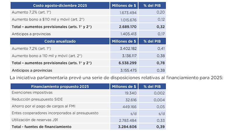 Aunque anualizado, los porcentajes son otros: el aumento del 7,2% a los jubilados y pensionados tendría un costo de $ 3.402.182 millones (0,41%/PBI) y el incremento del bono, $ 3.136.117 millones (0,38%/PBI). Lo que suma en total $ 6.538.299 millones (0,78%/PBI).