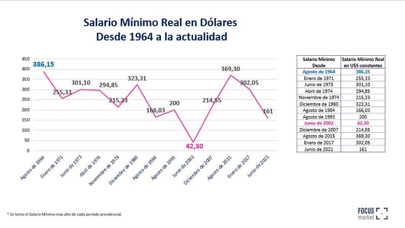 Di Pace remarcó quecuando se creó el SMVM en 1964 el mismo equivalía a u$s 386,15 y después de 57 años, en 2021, equivale a u$s 161."El resultado de la delicada economía Argentina está representado en esa persona que si nació en 1964, hoy tiene 57 años y el 38% del tiempo en su vida lo pasó en recesión en nuestro país", subrayó el director.