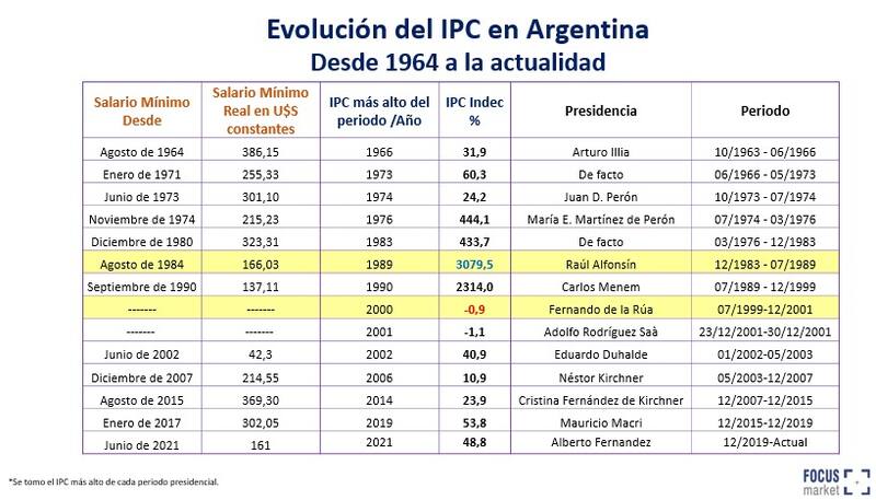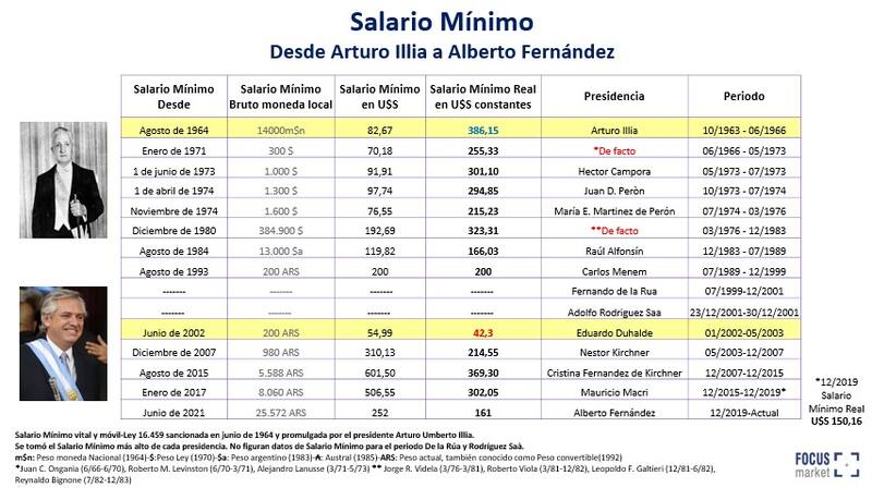 Desde la consultora Focus Market realizaron un informe sobre la evolución del SMVM más alto real en dólares constantes a lo largo de las diferentes presidencias en Argentina, con un cruce con la inflación en diferentes períodos.