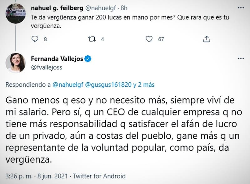 Tras ello, otro cibernauta de la red social cuestionó el posteo de Vallejos y, en ese sentido, le preguntó si lo que le daba vergüenza era ganar "200 lucas en mano por mes". "Qué rara que es tu vergüenza", remató el usuario.