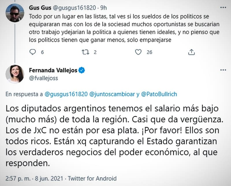 "Los diputados argentinos tenemos el salario más bajo (mucho más) de toda la región. Casi que da vergüenza. Los de Juntos por el Cambio no están por esa plata. ¡Por favor! Ellos son todos ricos. Están porque capturando el Estado garantizan los verdaderos negocios del poder económico, al que responden", le contestó la legisladora a través de su cuenta de Twitter.