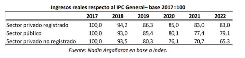 "Es decir, con el salario promedio de 2022 se pudo adquirir un 17% menos que con el salario promedio de 2017. Este trabajador perdió poder adquisitivo todos los años, excepto en 2022, que se mantuvo en igual valor que en 2021", detalla en el informe "Monitor de ingresos reales de los trabajadores privados formales, públicos y privados informales".