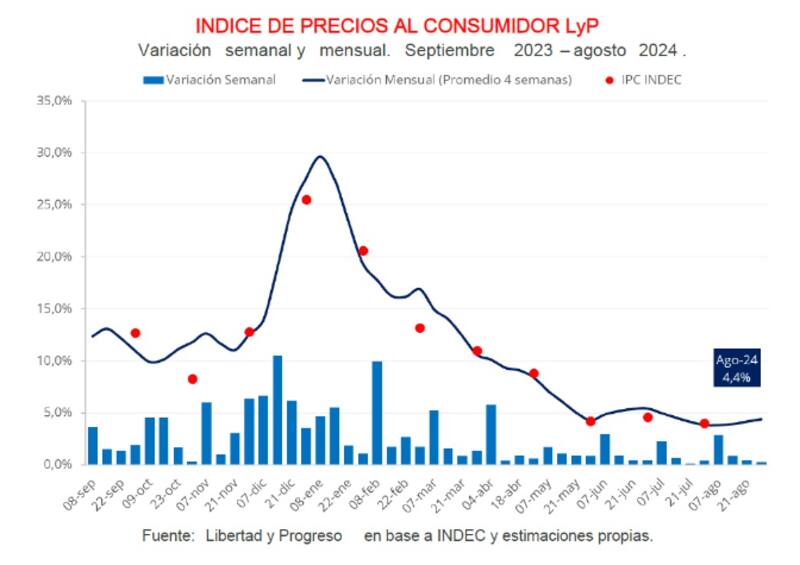 Según la medición de la Fundación Libertad y Progreso (LyP)estavariación se ubicó en 4,4%, lo que implicó una aceleración de 0,4 puntos porcentuales respecto a la de julio (4,0%).